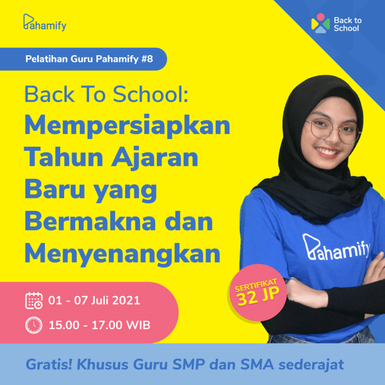 Kami dari Pahamify (Startup Pendidikan) akan melaksanakan Pelatihan Gratis dengan topik “Back To School: Mempersiapkan Tahun Ajaran Baru yang Bermakna dan Menyenangkan” selama 4 pertemuan pada tanggal 1, 3, 5, dan 7 Juli 2021 pukul 15.00 – 17.00 WIB melalui Zoom Meeting.